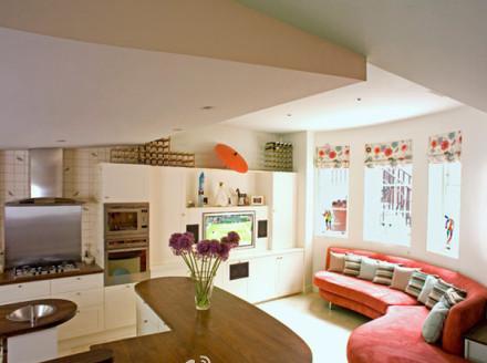 【弧形沙發(fā)】這是一個單間配套的戶型,為了節(jié)省空間,設計師把廚房餐廳以及客廳巧妙的融合到了一起。這款設計的特別之處在于弧形的設計,沙發(fā)背靠窗戶,減少了面積太小的壓迫感,而弧形的沙發(fā)又加大了整個空間的視覺面積,沙發(fā)特別設計的拐角讓你在看電視的時候也可以很舒適。