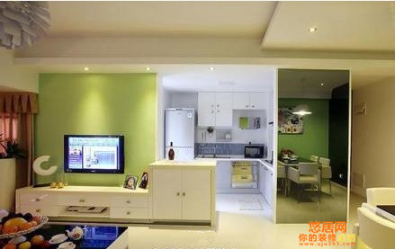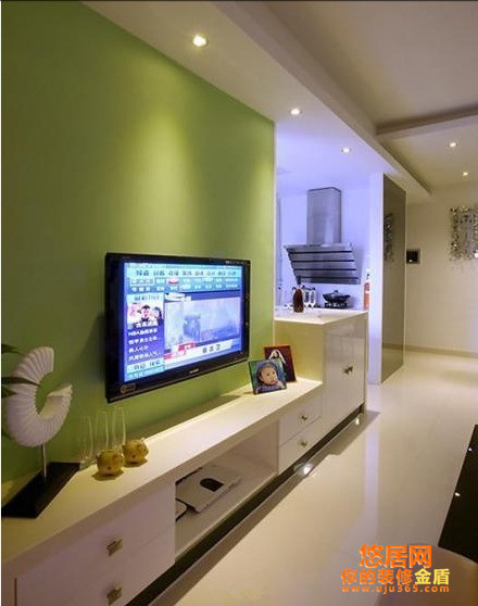 【電視墻】電視柜連接廚房的吧臺(tái),這個(gè)設(shè)計(jì)很巧妙的延伸了客廳的視覺(jué)面積。