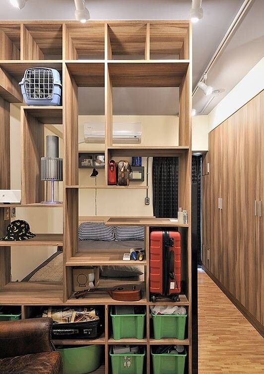 客廳與臥室之間用了一個(gè)木質(zhì)隔斷儲(chǔ)物架來(lái)進(jìn)行空間劃分,平日里,這一隔斷可以用來(lái)作收納,通過(guò)空隙處也能夠使整個(gè)空間都透出一份通透的感覺(jué),不會(huì)使空間因?yàn)檫@一隔斷的因素顯得狹小。
