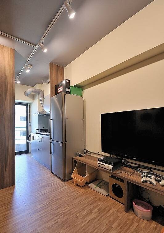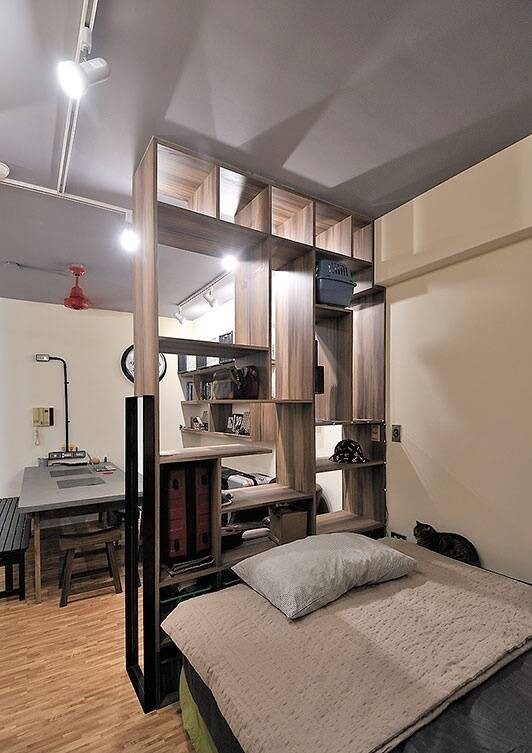 在這個(gè)一室三用的空間里,房主以最為簡(jiǎn)單直接的裝修設(shè)計(jì)方式來(lái)使用這一空間,既做到了強(qiáng)收納,也不影響整體使用的便利性。比如墻面上的書(shū)架,在可以收納的同時(shí)也裝飾了空白的墻面。