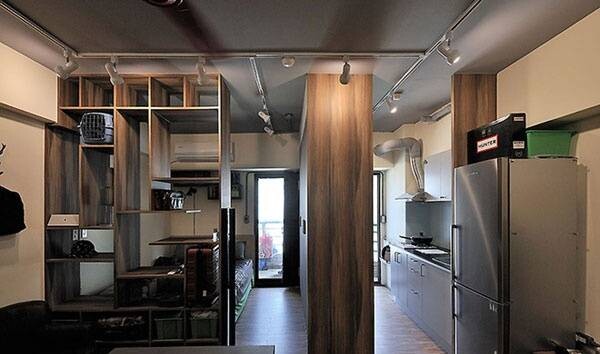 整個(gè)室內(nèi)都以木質(zhì)元素為主,無(wú)論是墻面上的木質(zhì)隔板書(shū)架,還是用來(lái)分隔空間的木質(zhì)隔斷儲(chǔ)物架,都讓這間屋子充滿了自然氣息。