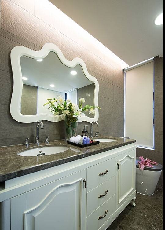 ▲線板門片搭配大理石材臺面,與藝術線條鏡面,沖突元素中體現(xiàn)混搭美感。