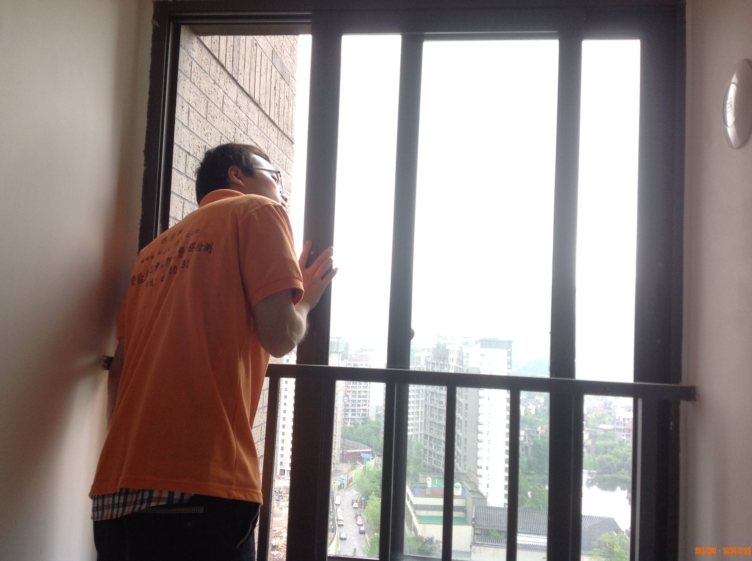 驗房師半個身子往窗臺外伸出去檢查窗戶外沿兒的防水是否做好。我們的驗房師也是蠻拼的!