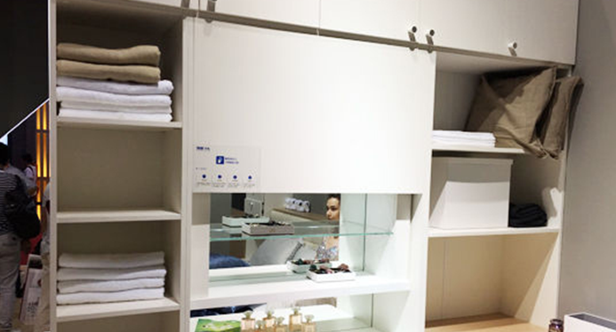 頂固推出了觸摸感應(yīng)式梳妝吊柜新品,該產(chǎn)品設(shè)置了觸摸感應(yīng)功能,能觸摸即停、弱電控制柜體升降,是本次展會(huì)上臥室智能產(chǎn)品的一支新秀。