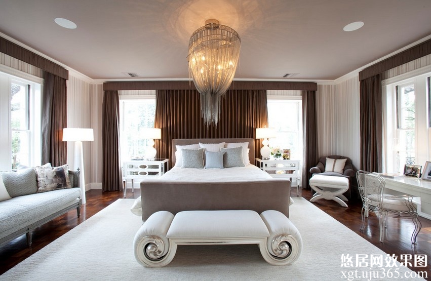6.這樣的臥室整體給人一非常尊貴的設(shè)計形式,在色調(diào)設(shè)計上多采用咖啡色加白色的設(shè)計形式,床頭軟包設(shè)計也讓人感受了濃濃的優(yōu)雅氣質(zhì)。