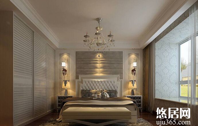 不同的裝飾品材質(zhì)都有著不同的質(zhì)感,即使是同一種色調(diào),也不會使得空間顯得單調(diào),反而會有意想不到的效果。白色皮質(zhì)背景墻、白色羽毛燈罩、白色羊絨地毯以及白色的棉質(zhì)床上用品,搭配起來能將空間拓展到極致,床頭的那種橫向線條能產(chǎn)生一種橫向的拉伸視覺效果,而兩旁的窗戶更是讓臥室有更多的自然光線,房間的透亮能夠有效地起到延展空間的作用;家具、布藝色調(diào)協(xié)調(diào)統(tǒng)一,也使臥室的裝修裝飾效果渾然一體,不顯雜亂。