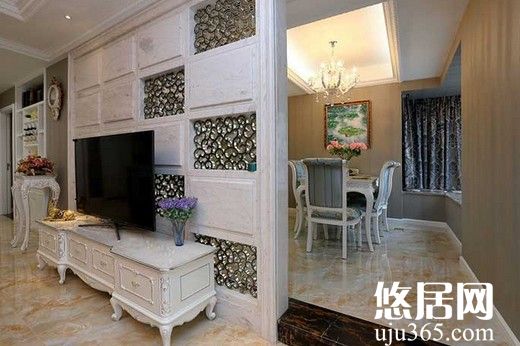 用歐式電視背景墻來做隔斷是一種比較有韻味的隔斷。其白色的墻壁磚肌理讓我們能感覺到它的歷史刻痕,墻面上造型精致美觀的支架,讓空間看起來更加富有美感。它的左側(cè)墻面采用的是橢圓形門框埡口設(shè)計,右側(cè)則是用未裝修的半截墻來作為空間隔斷,這樣的設(shè)計大膽、且很有藝術(shù)感。