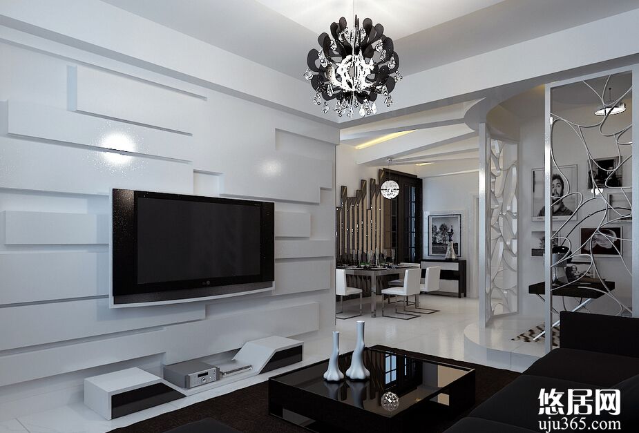 用現(xiàn)代電視背景墻做隔斷使得空間變得更加簡潔,白色的電視背景墻與整個客廳那簡潔的線條相融合,自由簡單的造型,還為客廳增添了一種現(xiàn)代感。