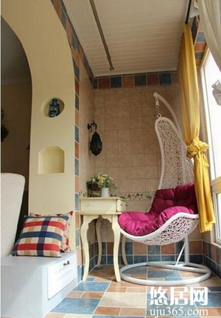 7.瓷磚的鋪貼讓陽臺的防水性提高不少,白色的蛋形吊椅恐怕是很多朋友夢寐以求的吧,玫瑰紅色的靠墊成為了帶有華麗典雅氣息的點綴,浪漫而有情調。黃色的窗簾也帶來了更加活潑的氣息。稍稍用點心思,就可以把陽臺裝扮得很精致哦!