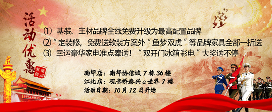 金秋十月秋風(fēng)送爽,值此佳節(jié)時(shí)分樂尚卻為廣大重慶裝修的業(yè)主送上“最激動(dòng)人心的裝修大禮”。樂尚裝飾自5月份在江北觀音橋成立最大整裝旗艦店以來,獲得廣大業(yè)主的一致好評(píng)。不僅讓業(yè)主體驗(yàn)到絕無僅有的整裝服務(wù),更把實(shí)惠真正帶給咱們老百姓。如今十月份樂尚更舉辦盛大“品牌閱兵”活動(dòng)。萬千業(yè)主共同見證,整裝大企再展雄風(fēng)。