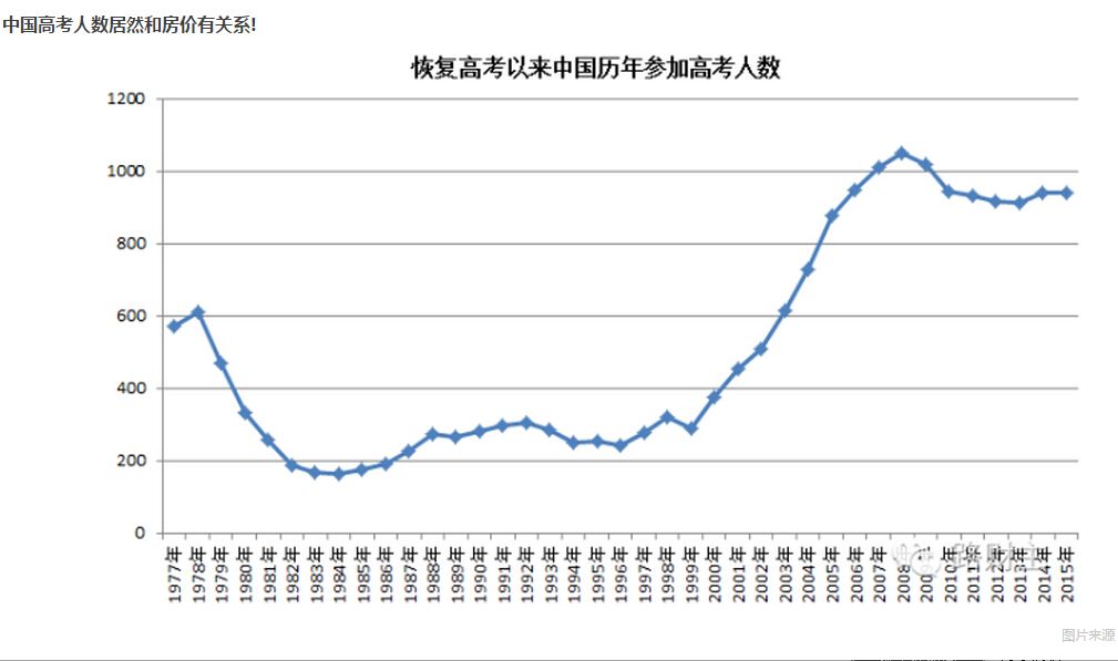 還有注意到一個信息,凡是那些問起在城市買房是否合適的網(wǎng)友,部分是大學(xué)畢業(yè)生,絕大部分都是大學(xué)畢業(yè)2-5年的樣子……中國歷年高考的人數(shù),是不是與中國城市的房價有關(guān)?