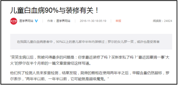 因此,某醫(yī)學大V就因此分析,白血病的誘因是裝修引起的。并通過各大媒體,發(fā)表長文《震驚!兒童白血病90%源于裝修》,引起網(wǎng)絡(luò)瘋傳。