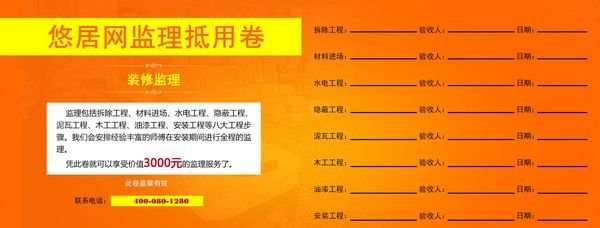 但如果你是裝修“小白”,而且也想省點錢,那就免費申請一張悠居網提供的價值3000元的家裝監(jiān)理抵用券,讓我們的專業(yè)人員來為你在材料選購和施工質量上嚴格把關。