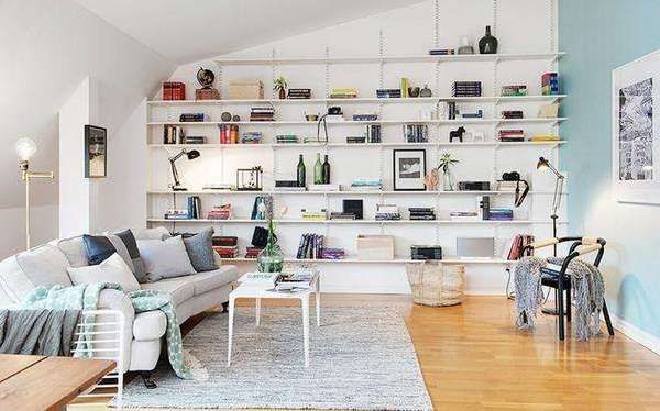 歐美電影里常常出現(xiàn)神秘又令人充滿好奇的閣樓場景,總是讓人想列入夢想清單里,但受限于天花板向下傾斜不好規(guī)劃,往往也被拿來當(dāng)作儲藏室來使用。這間公寓,不但沒有被傾斜的天花板困擾,更因為閣樓的先天優(yōu)勢采光良好。開放式的空間,讓屋內(nèi)不擁擠,空氣流通更順暢,陽光更充足。而書架直接用層板沒有邊框的設(shè)計,也解決了傾斜天花板,不好擺放家具的問題,不但很有風(fēng)格,能收納的空間也是一流。如此清爽的小閣樓,你也想要住嗎?