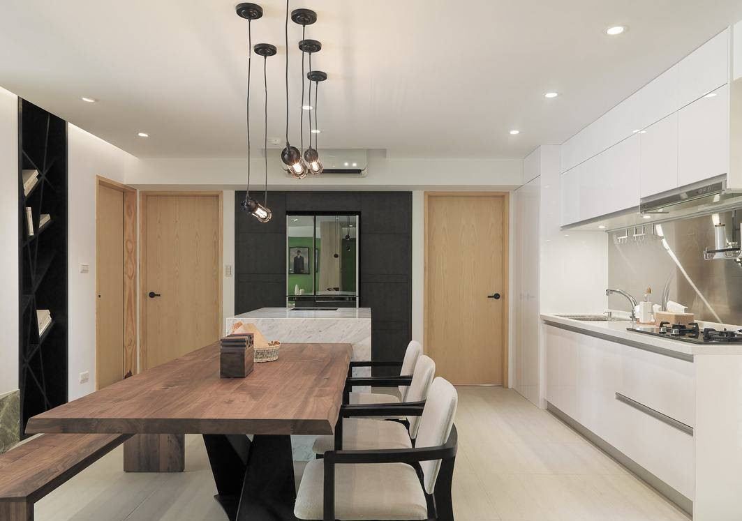 完全開放式的餐、廚空間里,大型電器與收納柜體收整于單一立面,以俐落態(tài)度簡(jiǎn)化空間線條。