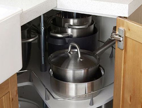 廚房收納,可以說是無所不用其極,水槽下,墻面上,冰箱門上,還有一個地方,想必一定是大家最容易忽視的地方,那就是廚房的轉(zhuǎn)角空間。這個空間說起來其實是很不討喜的,放大件的東西是放不下的,但是這里的收納空間可是不容小覷,你家里有還沒利用的轉(zhuǎn)角空間嗎?接下來就和堂主一起來看看如何讓這些轉(zhuǎn)角空間轉(zhuǎn)起來吧~向大家推薦一個拐角收納的秘笈吧~囫圇吞棗收納法,實際上上部掛鍋子的地方是做了可活動的軌道處理,基本上保證了取用隨心,當(dāng)然,死角內(nèi)先前安裝了柜板挖空的哦!這種收納方式還不錯吧~在拐角處安裝M型櫥柜,內(nèi)部可以根據(jù)功能需求設(shè)計隔板,放在最里面的東西,抽屜輕松一拉,就能輕而易舉的取到。真正做到了百分百空間利用率哦。將櫥柜拐角的收納區(qū)全盤轉(zhuǎn)換為操作臺是一個乾坤大挪移式的死角解決法,可有時候成套櫥柜已經(jīng)做好了,要改費時費力費工錢,還有機(jī)會挽救么?小編覺得,稍稍補(bǔ)救的機(jī)會還是有的,比如說,拐角臺板上配一個活動砧板,一防撞,二可以在切菜時利用拐角來穩(wěn)定砧板。
