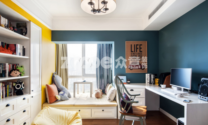 如何將全鋪的空間,變?yōu)闀?、客房、休閑房為一體的多功能房呢,書房部分,可房間左或右側(cè)地面留出一個(gè)地面空間,在其上方的墻面固定好桌板,做成書桌形式,書桌上方的墻面也可鋪排書架,這樣便能在留出工作區(qū)域的同時(shí)也不破壞榻榻米的整體性。
