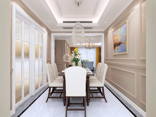 餐廳的裝修設(shè)計跟隨客廳設(shè)計,造型簡約,減少雕花等復(fù)雜的裝飾,采用線條裝飾,同時,空間色彩統(tǒng)一,在視覺上十分連貫。