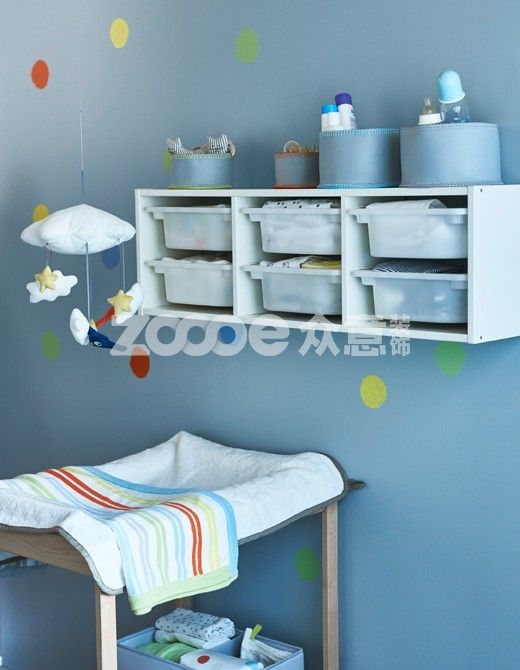 有了儲物件,在深夜為孩子換尿布時,不僅省去了到處翻找的麻煩,還能節(jié)省時間。垃圾桶和籃子掛在嬰兒換衣桌上方的墻壁上,孩子無法夠到,但你卻觸手可及。之后,你就可以將儲物件調節(jié)到地板高度,方便孩子取拿他們的玩具!