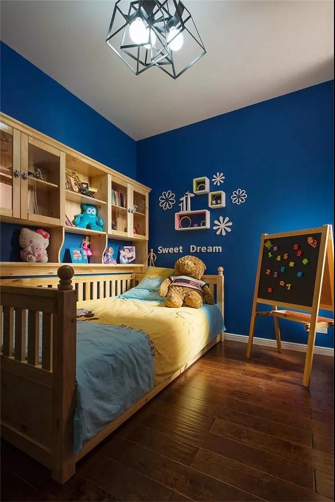 如果說湖藍是浪漫的代表,那兒童房的深藍更多的則是文靜而深邃,像知識的海洋。