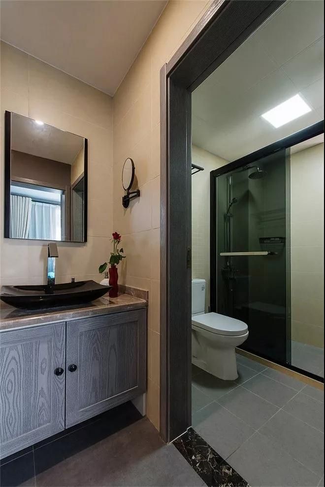衛(wèi)生間做了明顯的功能分區(qū),將干濕分開,淋浴以玻璃門做格擋,增加門沿,避免水濺入。