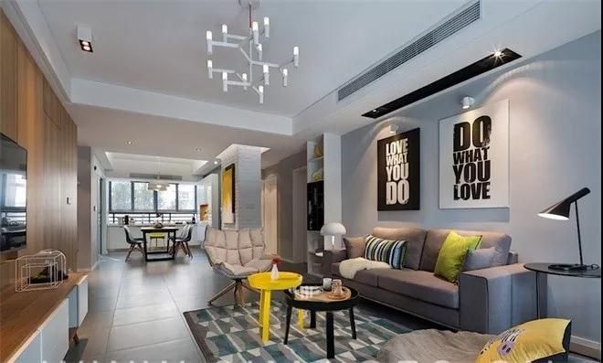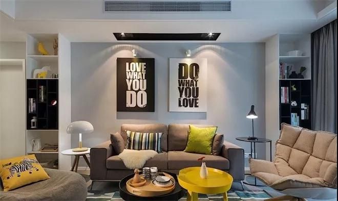客廳為左右對稱結(jié)構(gòu),講究平衡,穩(wěn)定,灰色是主調(diào),檸檬黃做點(diǎn)綴,整個空間清爽而簡潔。