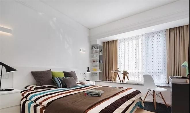 休閑型臥室,是讓人身心放松的調(diào)調(diào),卡其色窗簾,深咖床單,暖而不燥。