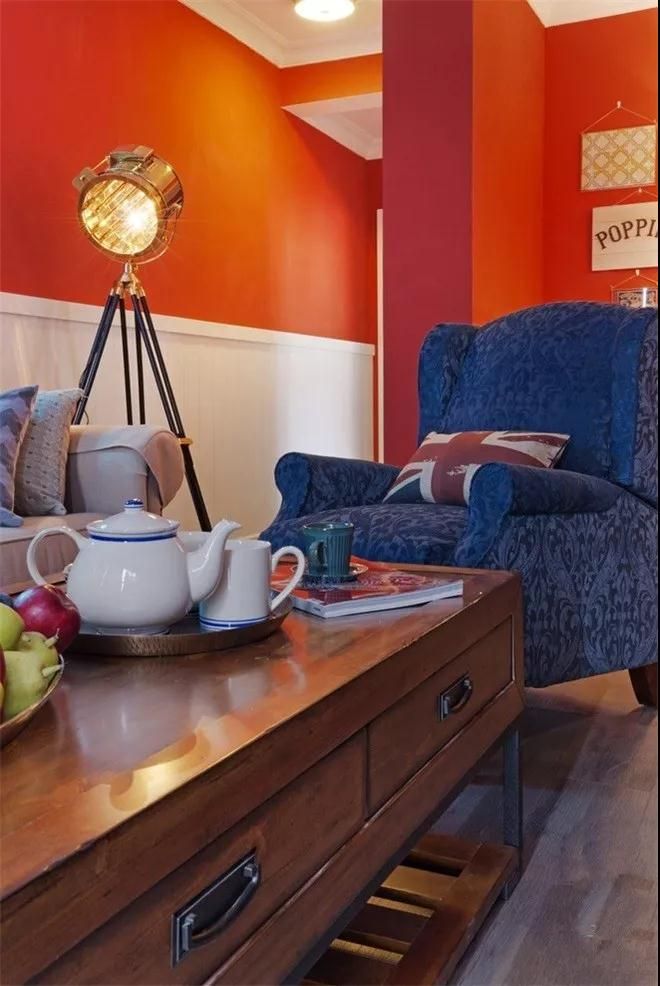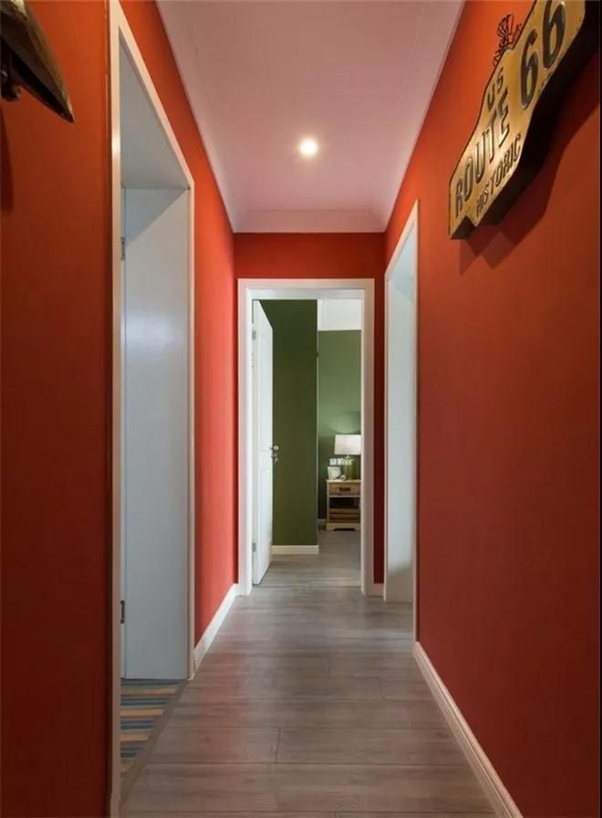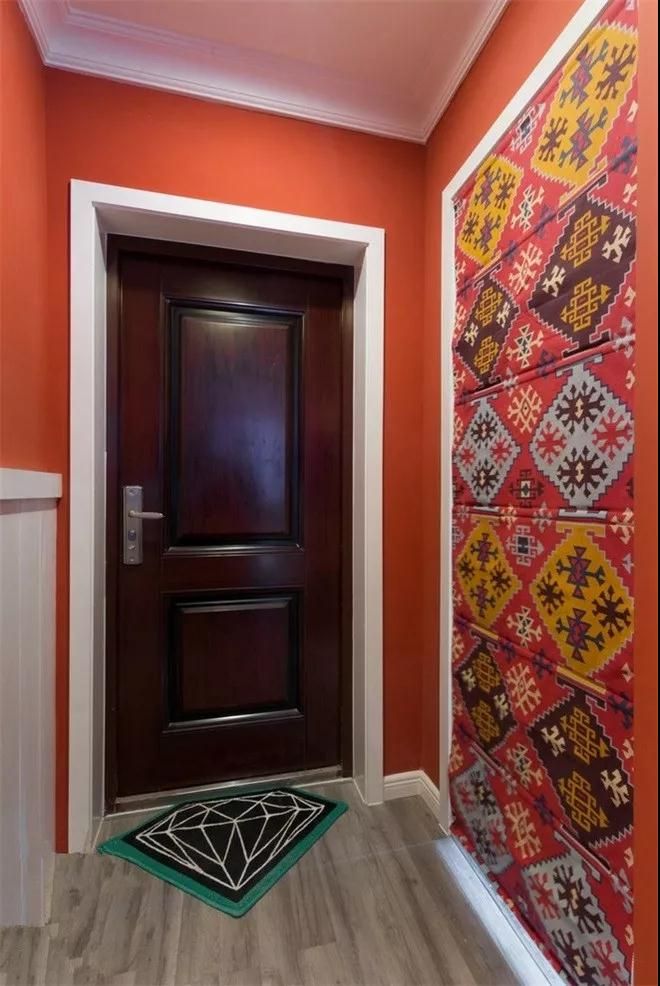 玄關(guān)的墻面與客廳同為橘紅色,一進門就能看到立面復(fù)古花紋裝飾門簾,烘托出房間的熱鬧與華麗。
