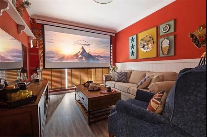 極具現(xiàn)代化的客廳,雖在整體設(shè)計上偏向復(fù)古暖調(diào),但絲毫不影響它整體的前衛(wèi),,不僅配備了120寸家庭影院,同時還把投影儀搬上客廳。