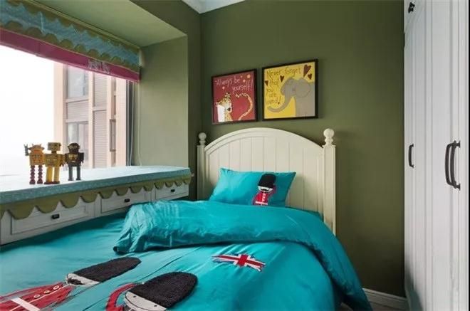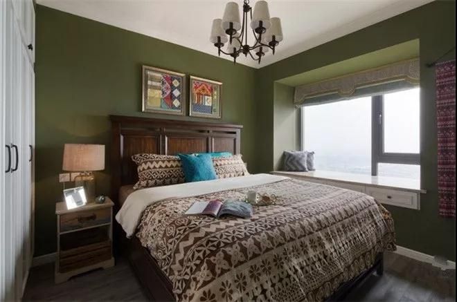 臥室的設(shè)計,沒有了客廳的熱烈,以偏暖的橄欖綠讓整個空間柔和下來。