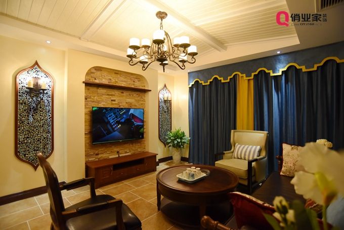 第四種,地中海裝修風格的背景墻:電視背景墻采用傳統(tǒng)復(fù)古式文化石與乳黃色乳膠漆,實木線條包圍馬賽克面包磚,外加壁燈,細看別有一番韻味。