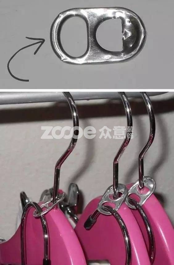 易拉罐上的開(kāi)瓶拉環(huán),平時(shí)總是當(dāng)廢品隨手扔掉,其實(shí)它和鞋帶一樣,也能起到增大衣柜空間的作用。將易拉罐的拉環(huán)套在衣架上,便可將多個(gè)衣架串聯(lián)起來(lái),這樣也能多掛上幾件衣服,非常簡(jiǎn)單實(shí)用。