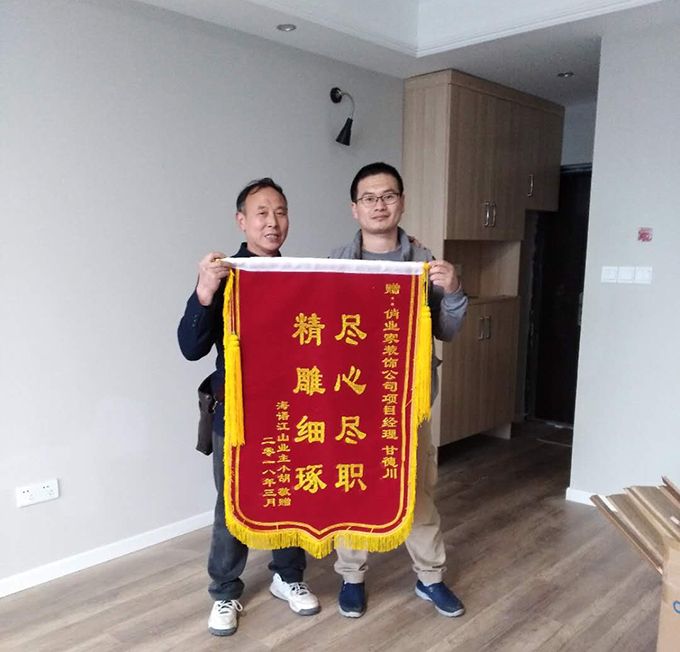 業(yè)主胡老師贈(zèng)俏業(yè)家裝飾工程有限公司項(xiàng)目經(jīng)理甘德川嘉獎(jiǎng)錦旗——“盡心盡責(zé),精雕細(xì)琢”。