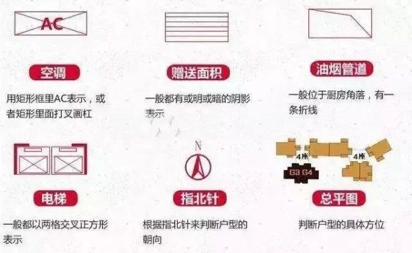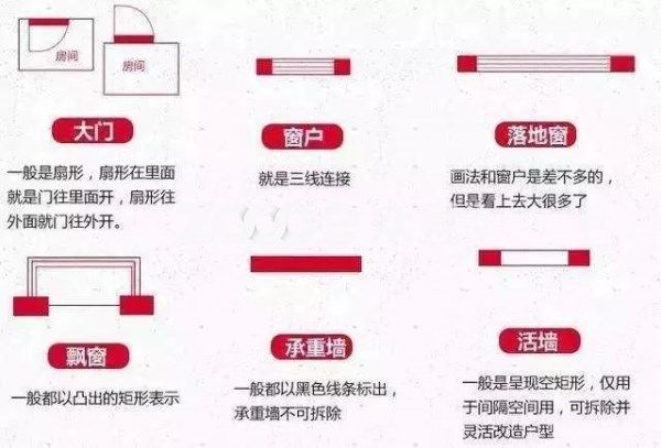 明白了這些圖標(biāo)的意思,拿來(lái)一張戶(hù)型圖,就能很快的分辨出各個(gè)標(biāo)記分別代表什么。