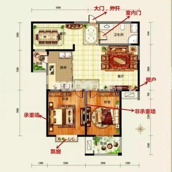 第一:客餐廳一體,客廳朝南開(kāi)窗,餐廳朝北開(kāi)窗,兩個(gè)窗戶(hù)之間無(wú)遮擋,風(fēng)能穿堂而過(guò)。