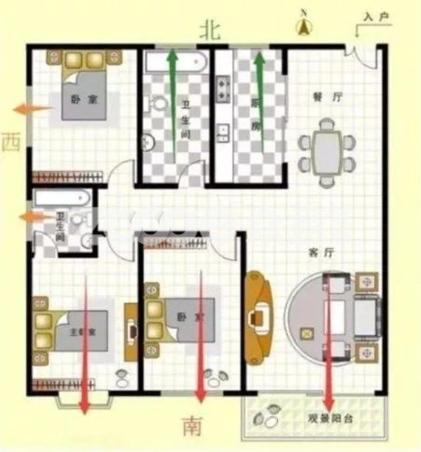 第二,南北房間門(mén)對(duì)門(mén),兩個(gè)房間打開(kāi)門(mén),風(fēng)能從一個(gè)房間穿過(guò)另一個(gè)房間。