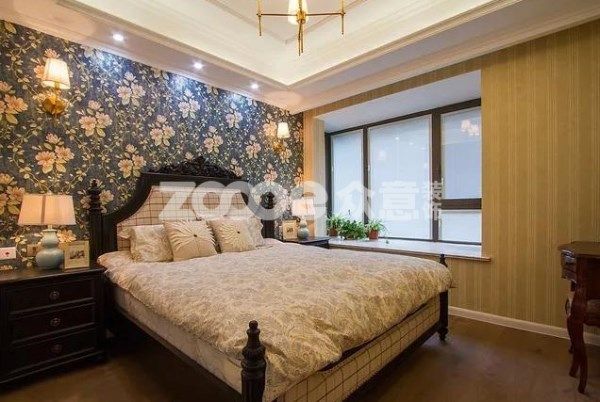 a.花紋墻紙。美式風(fēng)格就是休閑與復(fù)古的結(jié)合。最常用的床頭背景墻裝飾就是壁紙,而且是帶有繁復(fù)花紋的壁紙。