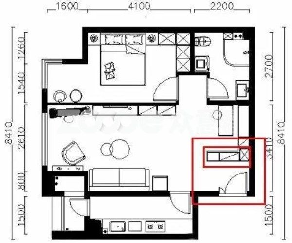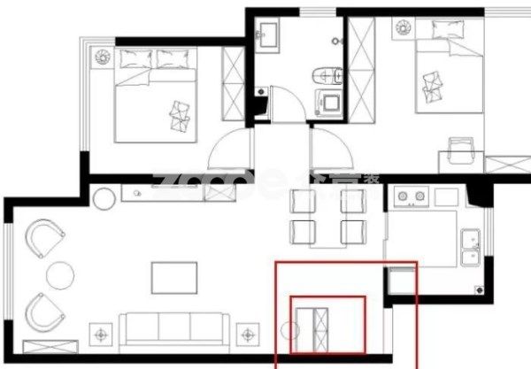 朋友家的戶型和上面的平面圖相似,入戶大門正對著餐廳,她想讓入戶空間能收納物品,最好能擋一擋餐廳空間,上圖是在入門的左邊設置了一個柜體,能放置入門后需要收納的物品,這種方法省事省力,能滿足大部分業(yè)主的要求。