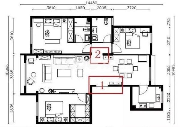有的戶型一進大門就是一條長長的走廊,很多時候走廊的盡頭是衛(wèi)生間的大門,對于這種情況,講究風水的小伙伴肯定不喜歡這種戶型,但是有時候沒辦法,買到了這樣的戶型怎么辦呢?上圖標記2的地方,就是在走廊的中間加了個隔斷,不僅起到裝飾作用,也避免破壞風水。