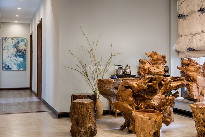 開(kāi)放式的茶室。木雕茶桌的不羈線條在陽(yáng)光的照射下,透露著光澤。