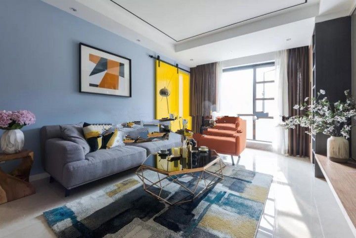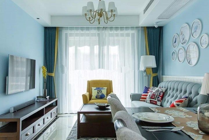 ▲藍(lán)色和黃色拼色窗簾,對(duì)應(yīng)單椅和墻面,黃色只用小部分,比例協(xié)調(diào)