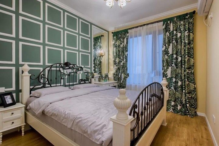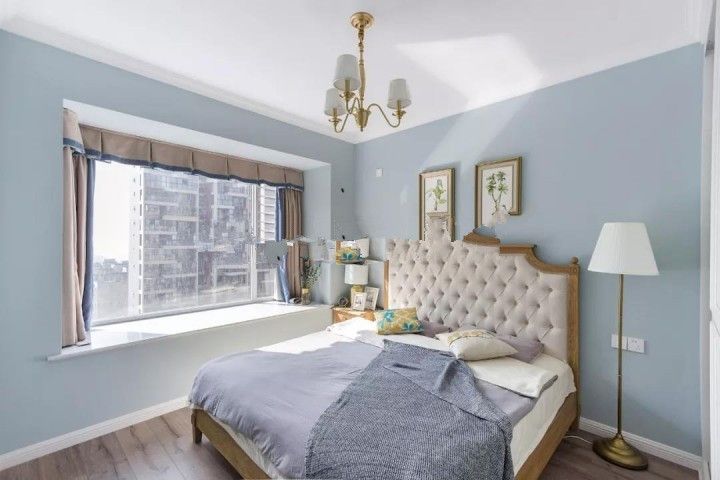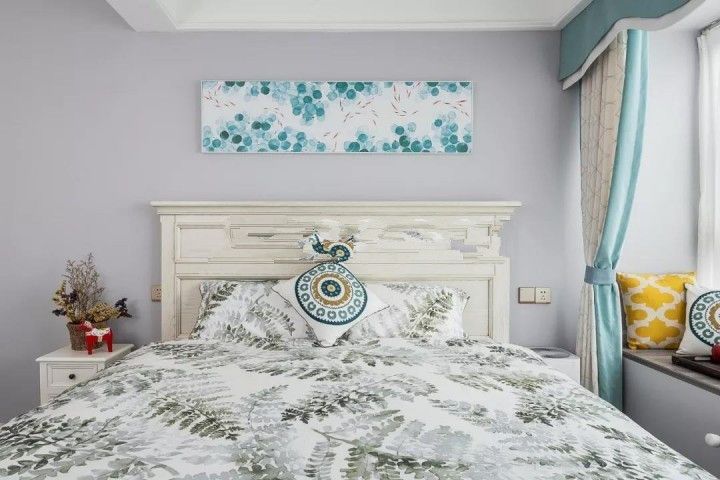 ▲床品是臥室的主色,窗簾的顏色隨著床品和床,加上床頭的畫也是同色系