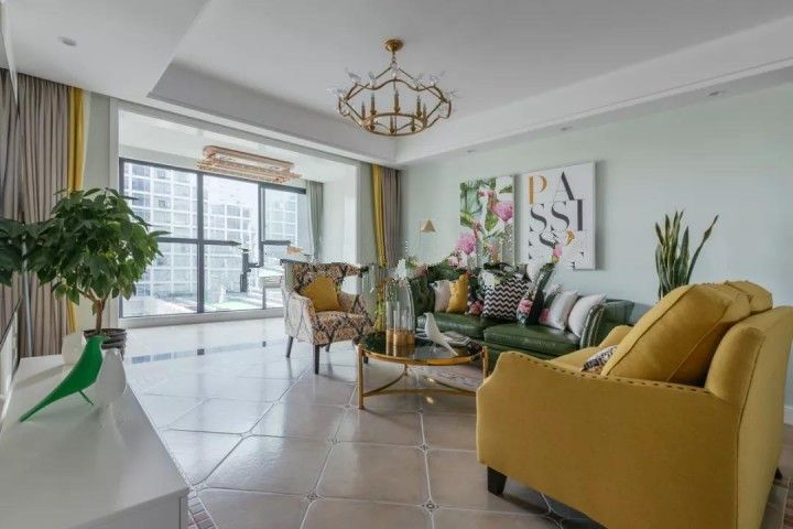 ▲黃色和灰色的拼色窗簾,軟裝中的畫、花、抱枕、燈具、地毯等也運(yùn)用這兩種顏色來(lái)配合,不會(huì)讓顏色過(guò)于單一