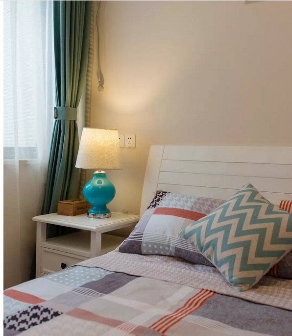 臥室床品與窗簾起了運(yùn)用淡雅綠色與清新的格子搭配整個(gè)空間溫馨舒適