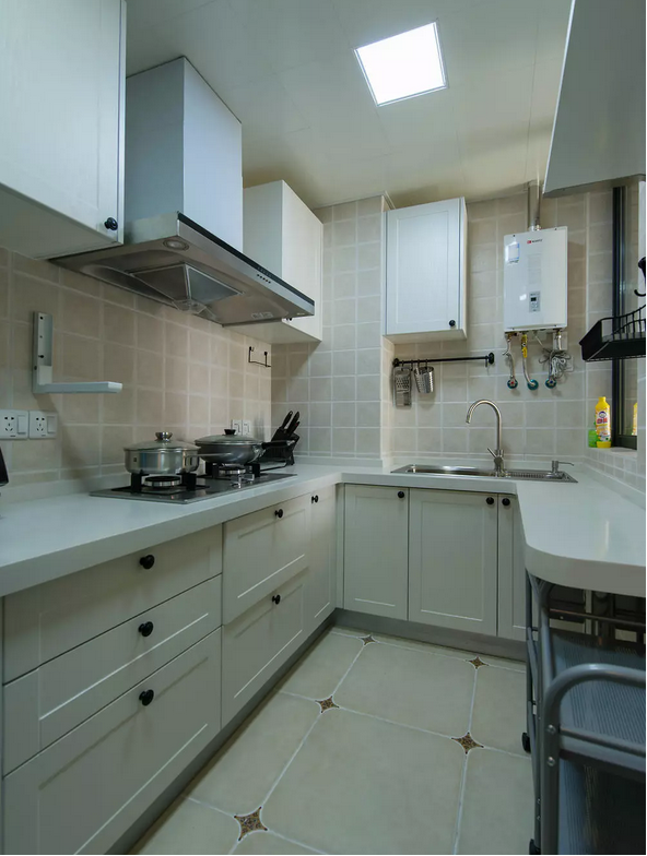 廚房白色櫥柜設(shè)計(jì)搭配米色地磚整個(gè)空間明亮整潔