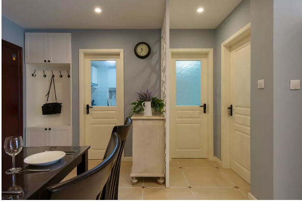 進(jìn)戶門出玄關(guān)屏風(fēng)與定制的鞋柜多為白色與淡藍(lán)色墻面相互呼應(yīng)淡雅至極