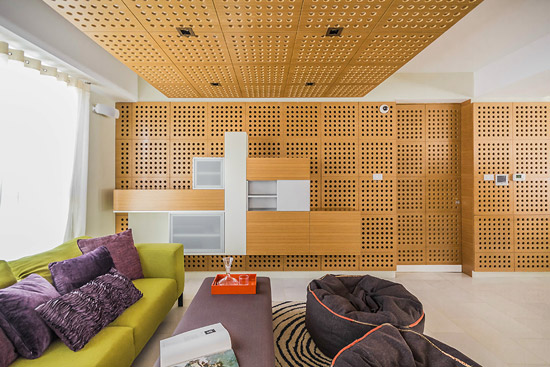 編輯點評:像蜂窩般的洞洞墻充滿質(zhì)感,特制的木質(zhì)面板能有效地實現(xiàn)隔音和增強室內(nèi)的音效的功能,讓主人盡情地演奏而不用擔心會影響到鄰居。