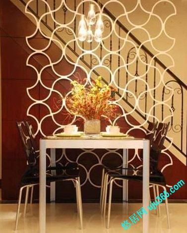 獨(dú)立的小餐廳一般難以形成良好的圍合式就餐環(huán)境。此法針對(duì)這一問(wèn)題,在小餐廳的上方天花上做小型的方型吊頂以壓低就餐空間,營(yíng)造餐廳的圍合式就餐氣氛; 同時(shí)將吊頂和吊燈合二為一,由于吊頂?shù)淖饔?,此處可以選擇價(jià)格便宜的吊燈,但借助吊頂?shù)臍鈩?shì),完全可以烘托就餐的主題,并且滿足了空間、照 明等諸多功能需求。