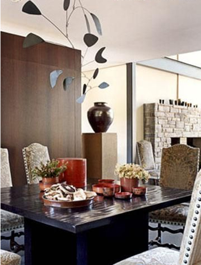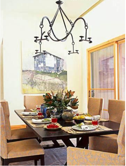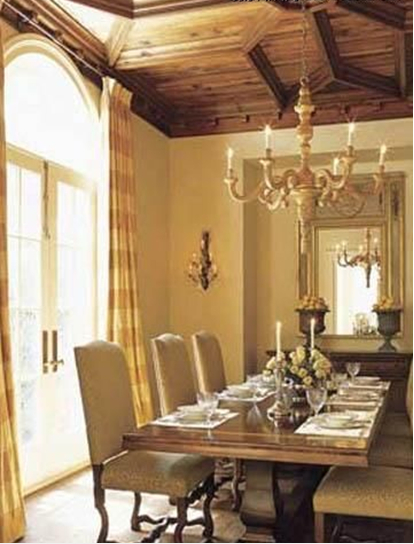 這個餐廳的視覺焦點莫過于其漂亮的木雕天花板,用木條勾勒出對稱的圖形,帶有柔美曲線的餐椅迎合空間的整體風格,美式鄉(xiāng)村不一定很敦厚很粗獷,也可以很柔情很優(yōu)雅。