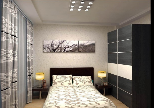 臥室不大不小但整體和諧,規(guī)整床旁的兩個(gè)古樸臺(tái)燈又點(diǎn)綴了專(zhuān)題片,其壁柜簡(jiǎn)單大氣有節(jié)約了空間與窗簾的似豹紋窗簾遙向呼應(yīng),更顯大氣。